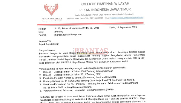 Ditambahkannya, tembusan surat aduan ini juga dikirimkan ke berbagai pihak terkait, termasuk BPJS Kesehatan, BPJS Ketenagakerjaan, Dinas Tenaga Kerja dan Transmigrasi Provinsi Jawa Timur, Satpol PP, Dinas PUPR, Disperkim, hingga DPMPTSP Kabupaten Kediri.